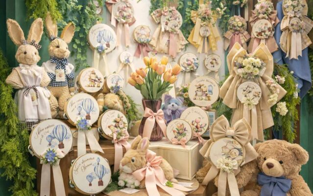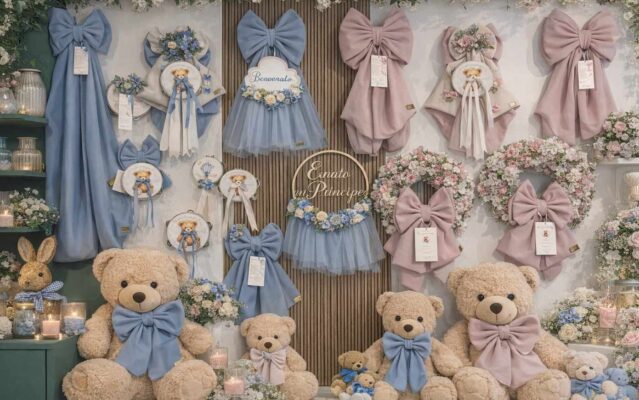 C’è poi la dimensione più dolce e simbolica: fiocchi e tamburelli pensati per annunciare una nascita, con un approccio tenero ed elegante.