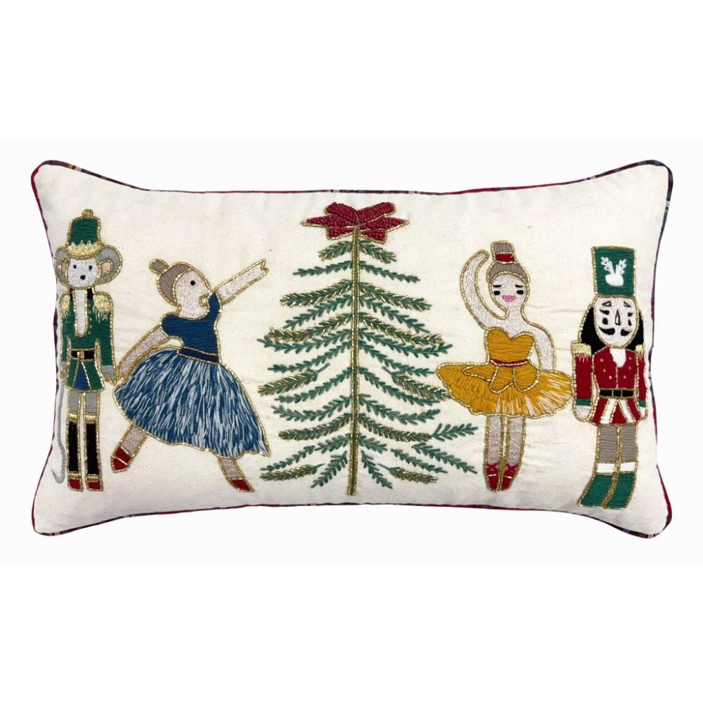 Cojín de algodón con bordados navideños: árbol, cascanueces y bailarinas. Colores vivos y estilo de cuento de hadas.