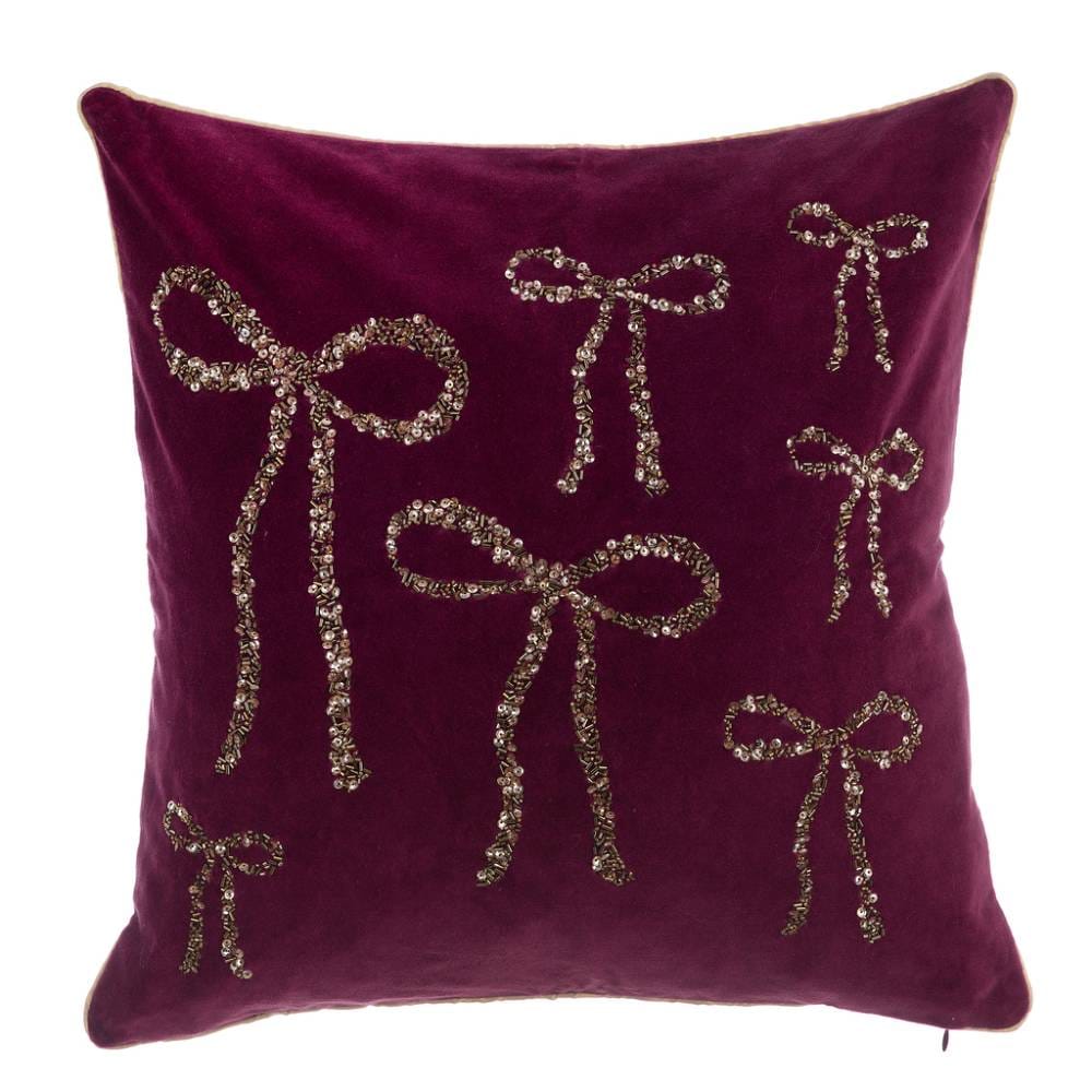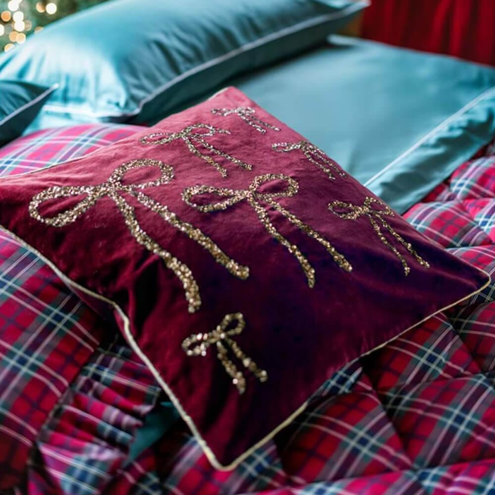 El cojín bordado de la colección Nastro d’Oro de Blanc MariClò aporta un toque refinado y festivo a los interiores. Fabricado en suave microfibra con efecto aterciopelado, destaca por su intenso color burdeos y sus brillantes detalles: lazos decorativos cosidos con lentejuelas doradas que captan la luz. El ribete en contraste realza su forma y calidad de confección. Perfecto sobre sofás o camas durante las Navidades, es un accesorio de decoración que combina encanto y comodidad.