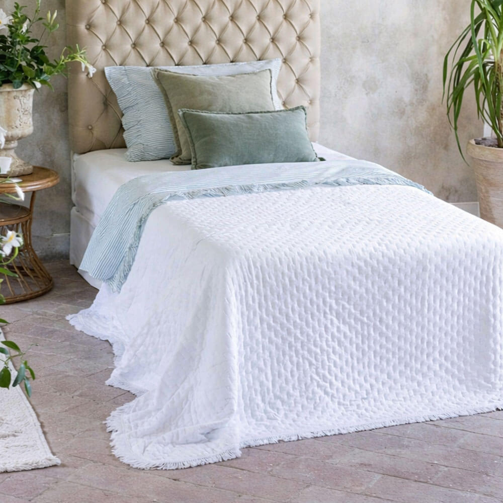 El blanco puro ilumina la habitación y realza cualquier decoración, desde la clásica shabby a la minimalista contemporánea. El acolchado geométrico en relieve añade volumen sin añadir peso, mientras que el borde con flecos le da un refinado toque boho-chic.