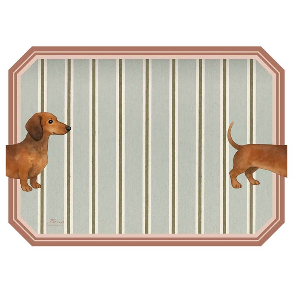 Mantel individual de vinilo con dibujo de rayas verdes y detalles irónicos de un perro salchicha partido en los laterales. Borde rosa y corte octogonal. Colección Amici Animali.