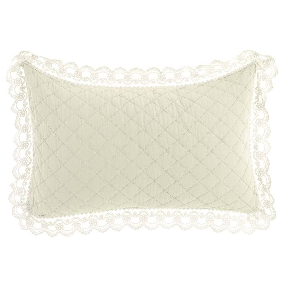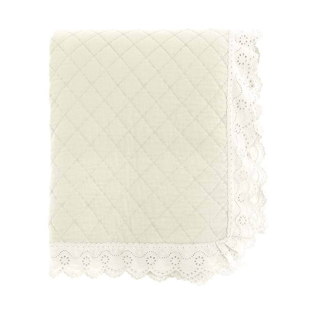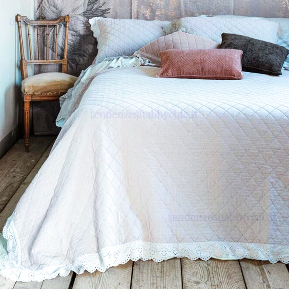 Colcha doble acolchada de microfibra color crema con gala de encaje sangallo. Incluye 2 fundas de almohada a juego.