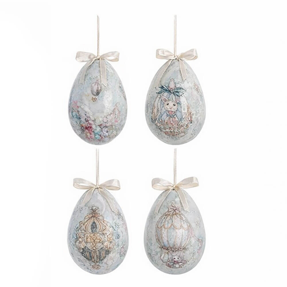 Este refinado juego de 8 huevos de Pascua decorativos de Blanc MariClo pertenece a la colección Rococó y se caracteriza por su estilo romántico y Shabby Chic. Los huevos, de superficie lisa y acabado mate, están decorados con delicadas ilustraciones en tonos azul polvo, azul empolvado y marfil: conejitos, globos, lazos y motivos florales de inspiración retro. Cada huevo se completa con una elegante cinta de raso para colgarlo.
