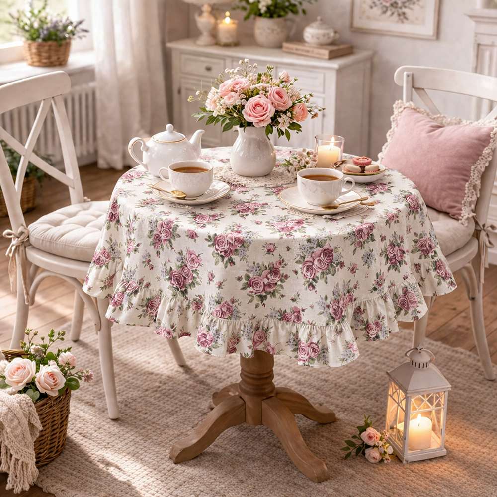 El estampado floral se distribuye armoniosamente por toda la superficie, creando un efecto visual ligero y refinado. El detalle distintivo es el volante en todo el perímetro, que aporta movimiento y volumen, haciendo que el centro de mesa sea aún más decorativo y femenino.