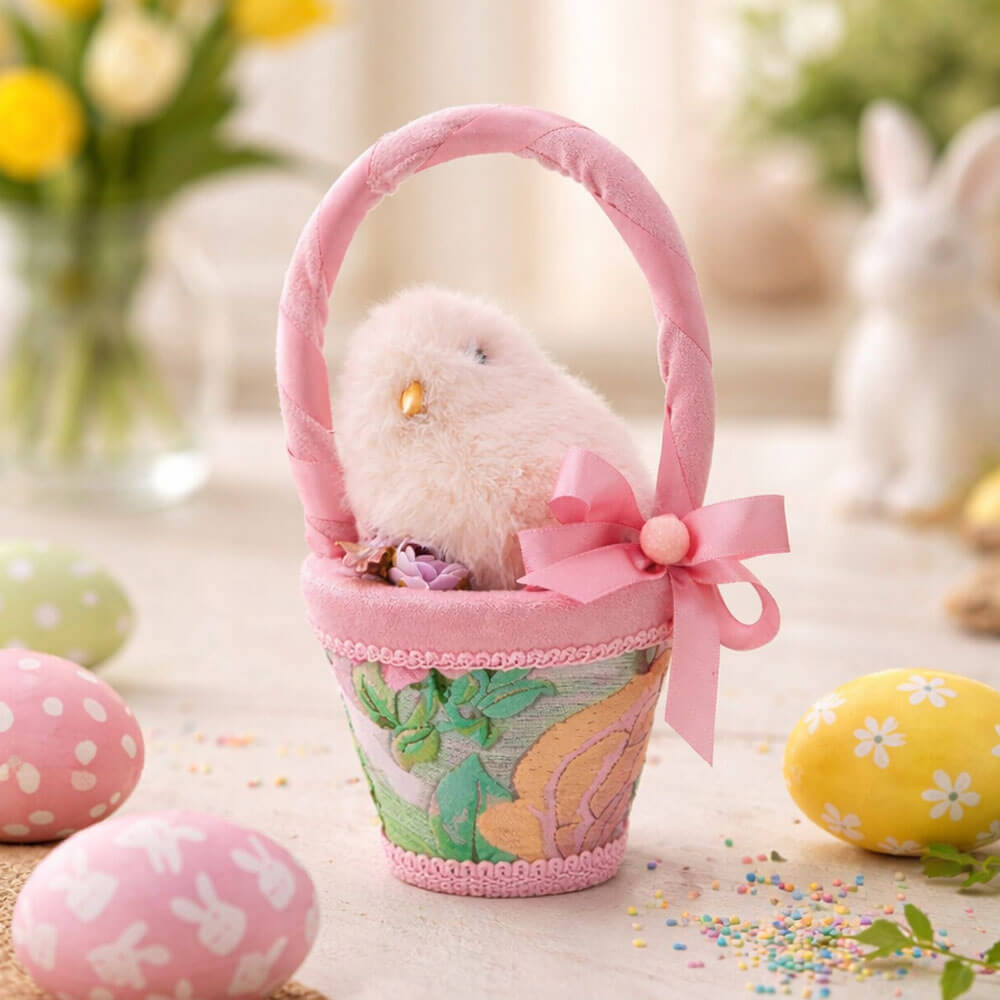 Cesta decorativa de tela rosa con pollito de peluche, flores y lazo. Encantador detalle shabby para Pascua.