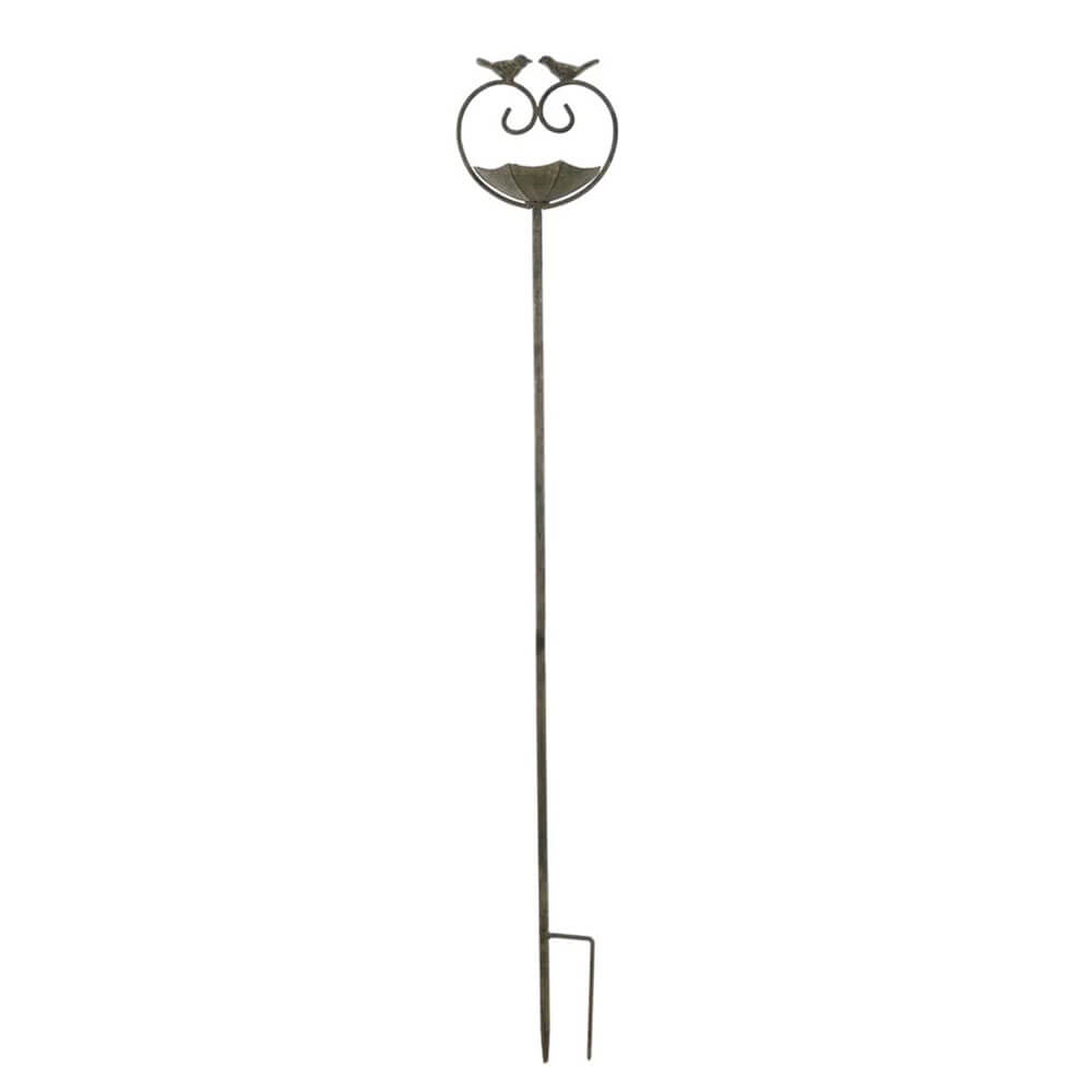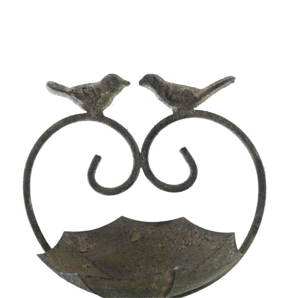 Comedero de jardín metálico con doble decoración para pájaros y cuenco para hojas. Colección Jardín Secreto.