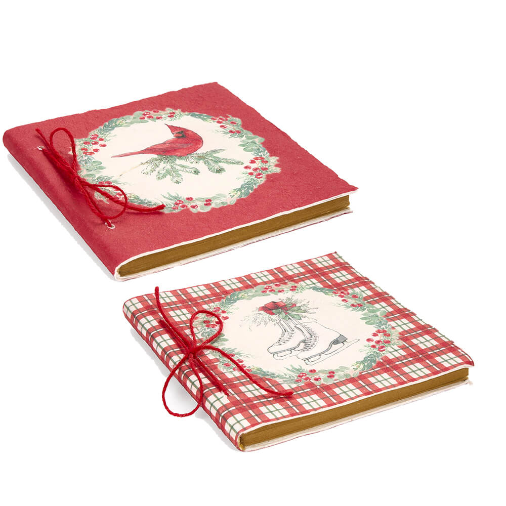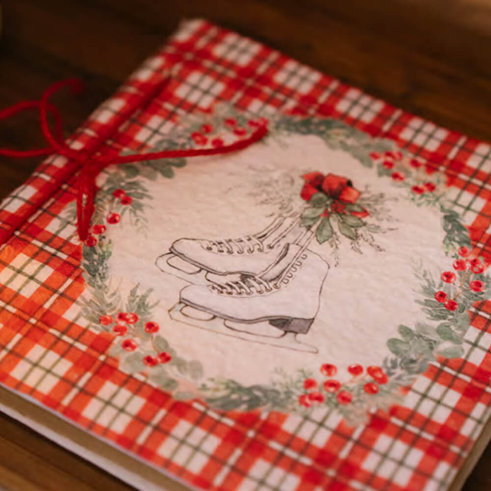 Libreta con adornos típicamente navideños, perfecta para regalar a una persona especial. Disponible en dos diseños, el primero presenta una funda roja con un bonito diseño de un pájaro con una corona de acebo. En cambio, el segundo modelo presenta una cubierta de tartán rojo y blanco y hermosos patines blancos en el centro.