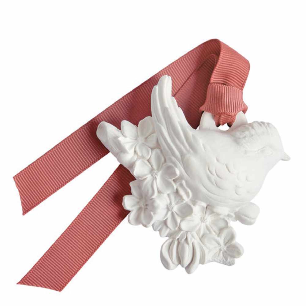 Una delicada decoración perfumada en forma de pájaro entre flores, con cinta para colgar: ideal para perfumar armarios, cajones y pequeños espacios con una nota primaveral.