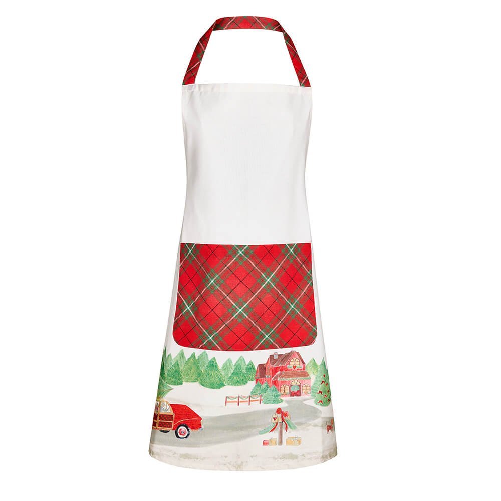 Este delantal ofrece cobertura total y comodidad superior mientras cocinas. Hecho 100% de algodón de alta calidad, el delantal es tan funcional como hermoso. El diseño presenta un encantador patrón de tartán rojo y verde, perfectamente combinado con una vibrante escena navideña que representa una casa decorada y un paisaje invernal. El detalle del gran bolsillo central con estampado de tartán no es sólo un elemento decorativo, sino también sumamente práctico para tener a mano utensilios de cocina o recetas. Los lazos en la cintura aseguran un ajuste perfecto para todas las tallas, haciendo de este delantal un accesorio imprescindible para los amantes de cocinar durante las vacaciones.