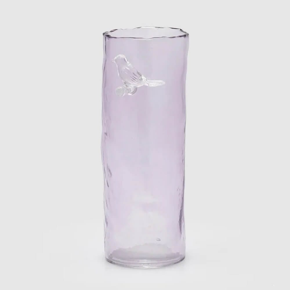 Un jarrón cilíndrico de cristal lila con una superficie ondulada y una decoración exterior transparente de un pájaro en una percha. Un toque refinado para decoraciones elegantes y primaverales.