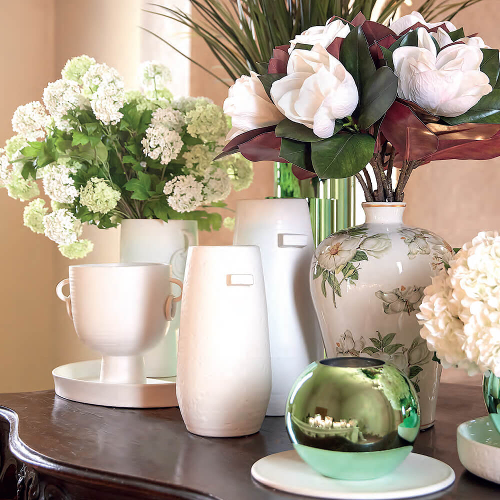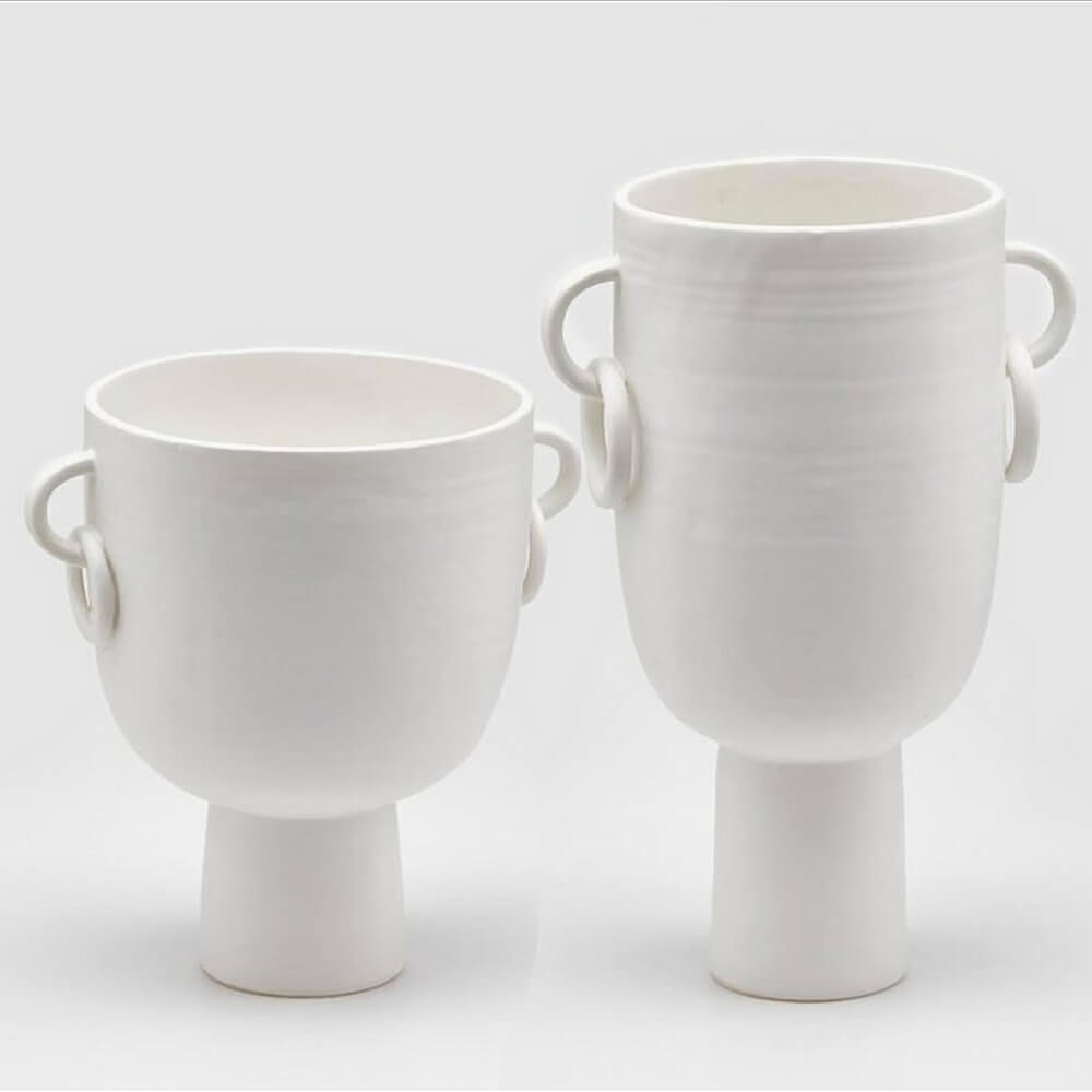 Jarrón de centro de mesa en forma de copa de cerámica blanca mate con asas sobre pedestal. Un producto firmado EDG . Disponible en dos tamaños