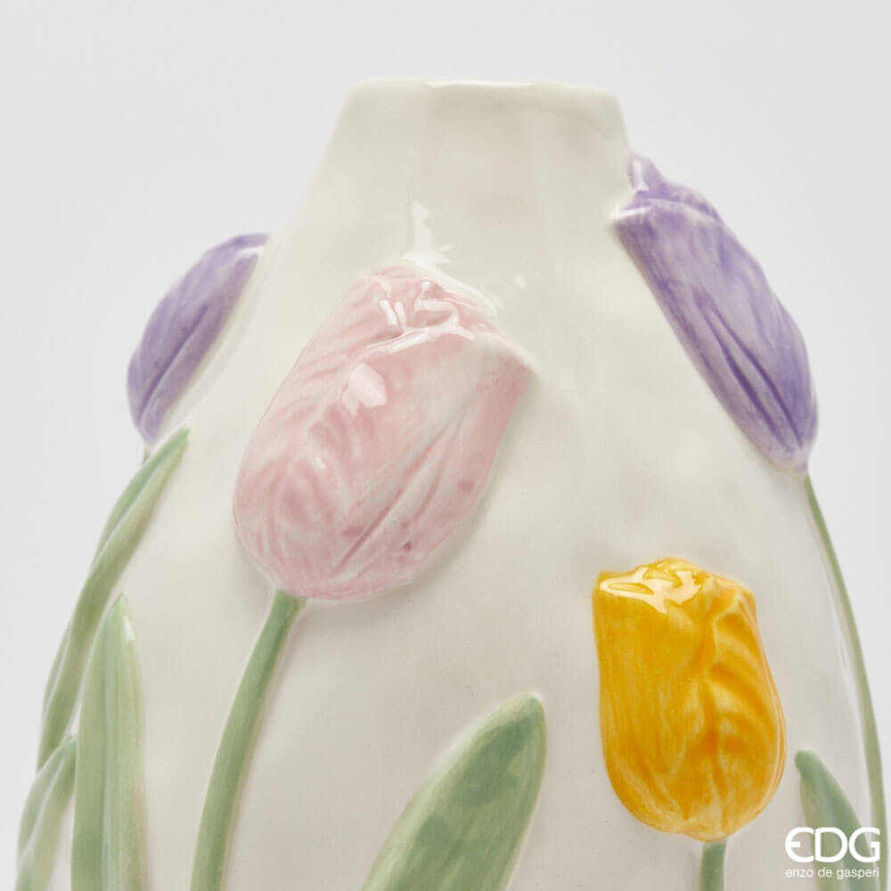 Jarrón ovalado de cerámica hecho a mano con tulipanes multicolores en relieve. Elegante, primaveral e impermeable.