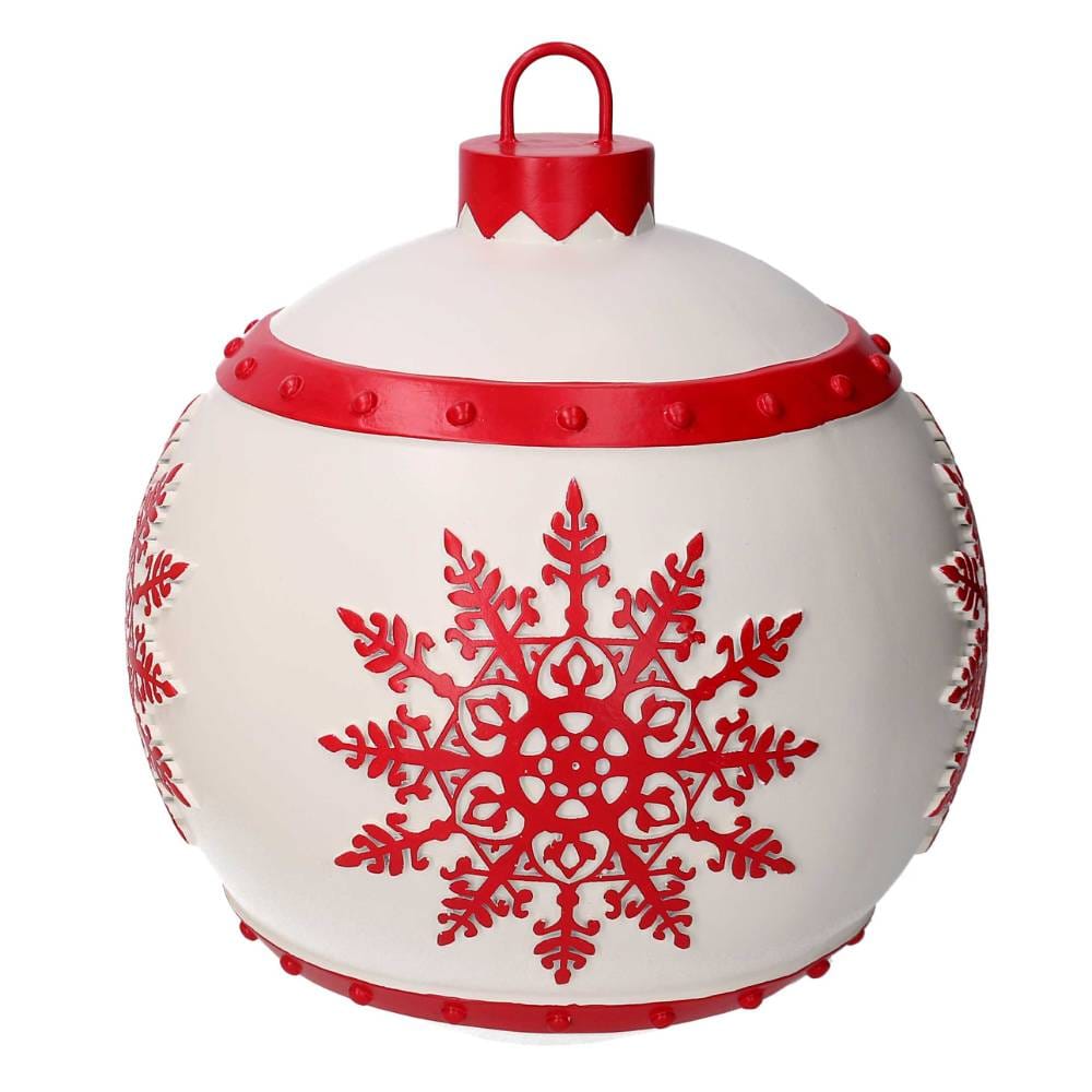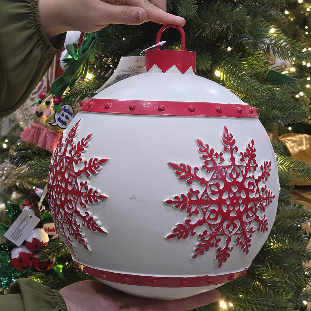 Esta majestuosa esfera decorativa de resina blanca está adornada con copos de nieve y motivos rojos que realzan su sofisticación.