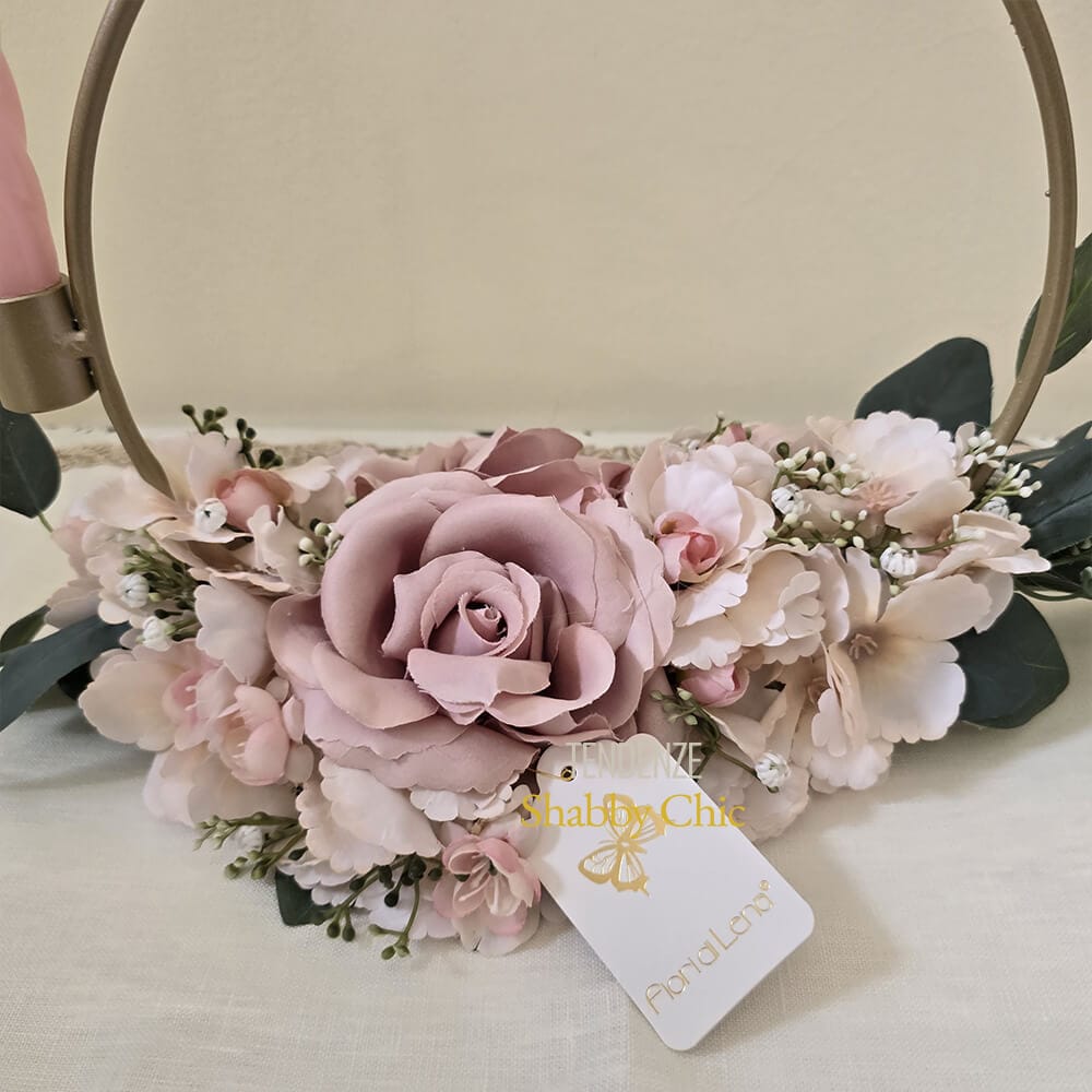 El candelabro círculo Fiori di Lena es una creación que encanta por su forma ligera y su refinamiento floral. La estructura de metal dorado sostiene una composición artesanal delicadamente perfumada de rosas en polvo, hortensias, begonias y niebla sobre una base de hojas verde salvia. Una vela rosa twist, incluida de regalo, completa el diseño para darle un toque de luz y poesía.