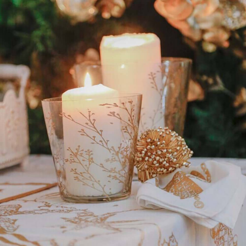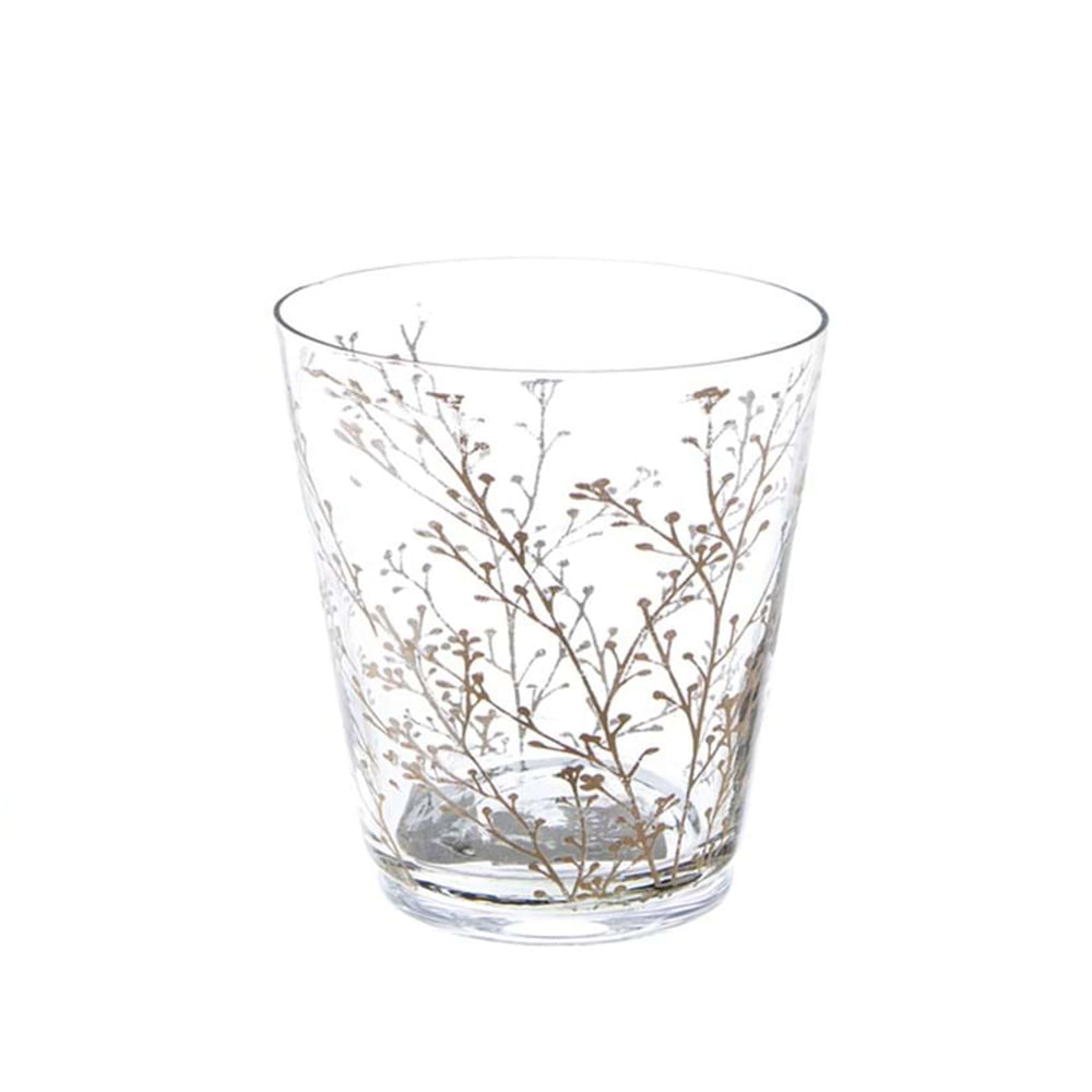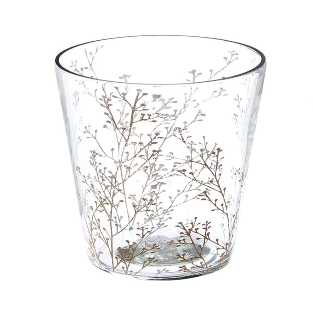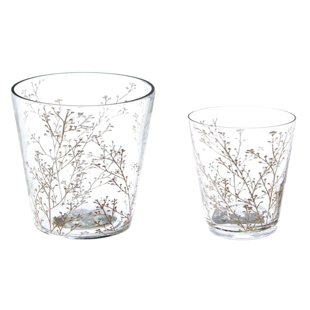 Set compuesto por 2 portavelas de cristal con ramas decorativas en color dorado.