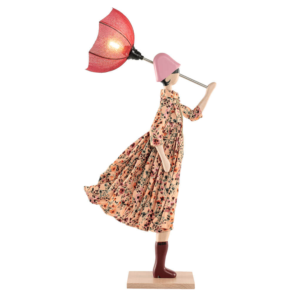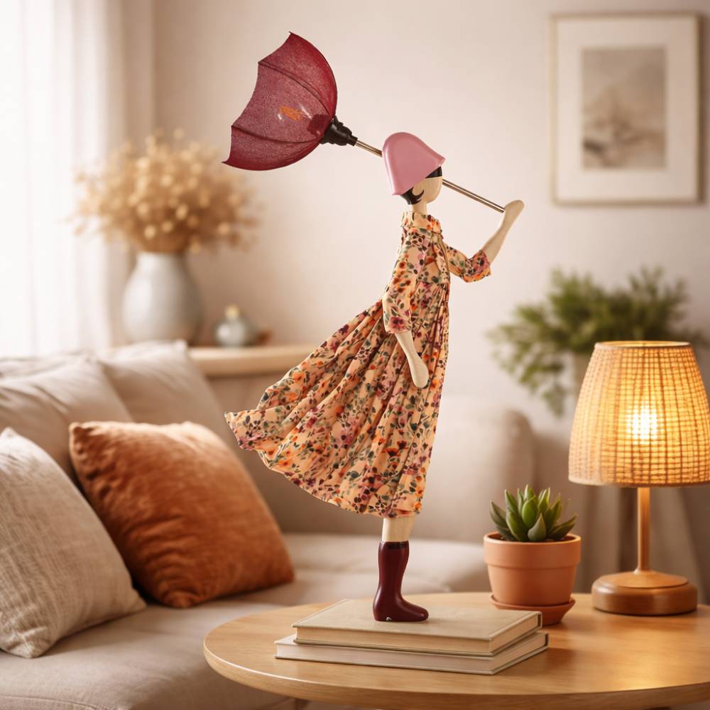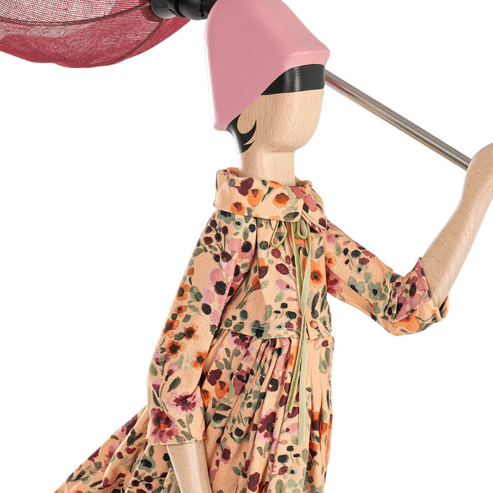 Hecho a mano en Grecia con madera y tela, representa una joven figura que se enfrenta con gracia al viento mientras su paraguas se transforma en una delicada pantalla burdeos.