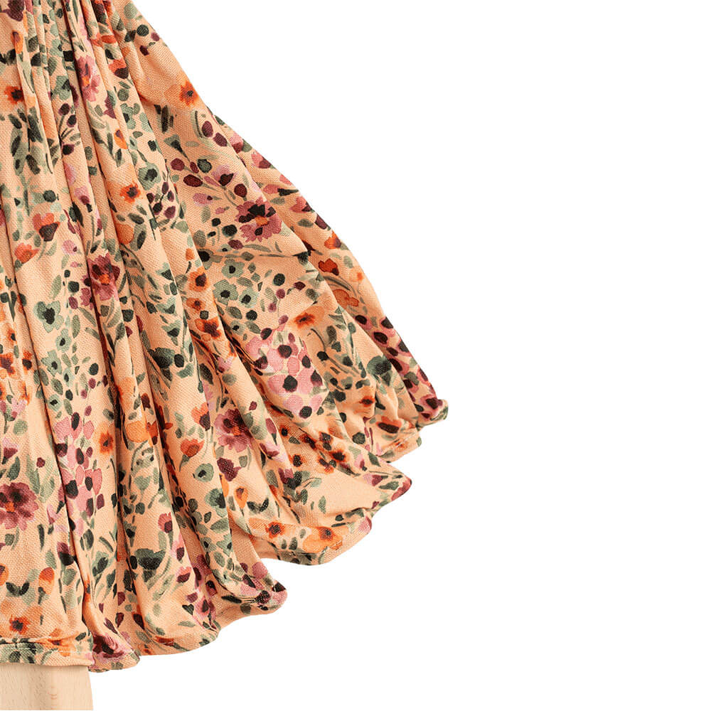 El vestido floral, en tonos cálidos de melocotón y naranja, se mueve con la ligereza de una brisa de verano, difundiendo una sensación de armonía y dulzura. La base de madera natural añade un toque auténtico y refinado, perfecto para realzar habitaciones de estilo Shabby Chic o moderno.