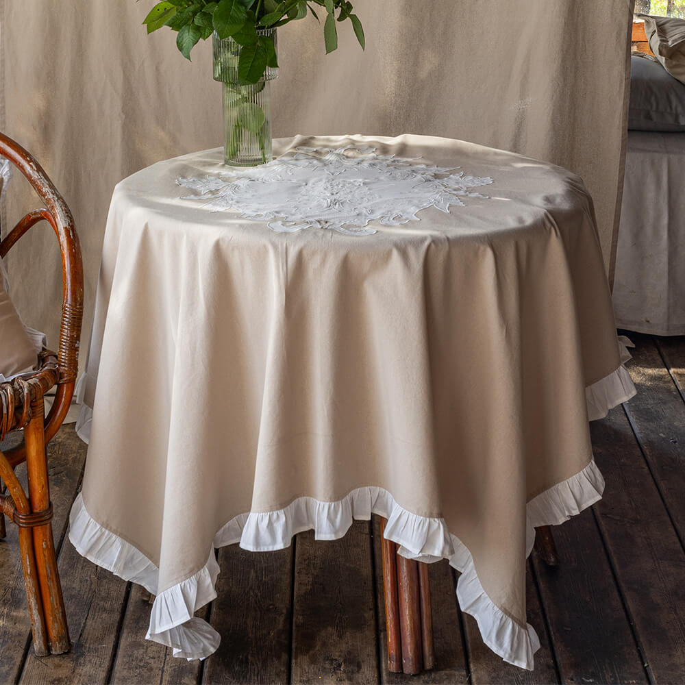 Perfecto para mesas redondas o cuadradas, este mantel es ideal para enriquecer los ambientes rústicos, románticos o de inspiración campestre francesa. Se presta a arreglos refinados para cenas en terrazas, cenas especiales o simplemente para decorar con gusto el espacio cotidiano.
