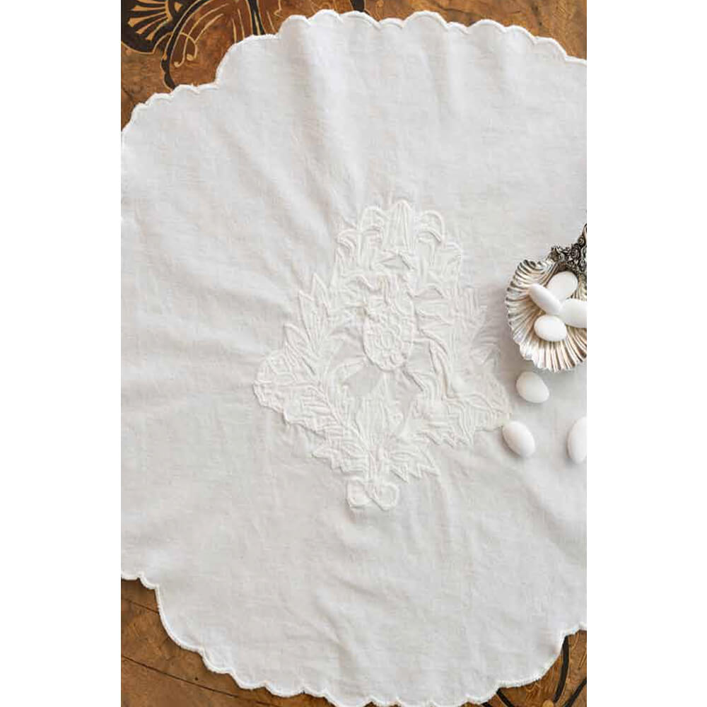 Fabricado en algodón natural, este elegante mantel individual de la colección Capodimonte está adornado con un aplique central tono sobre tono que recuerda motivos florales, ejecutados con extrema artesanía. El borde festoneado le da un toque extra de delicadeza, haciéndolo perfecto para ocasiones especiales, fiestas de confeti, recepciones o desayunos elegantes. El luminoso color blanco complementa cualquier estilo de decoración, desde el Shabby Chic hasta el clásico, realzando la calidad de los detalles bordados. Un objeto tan funcional como decorativo, capaz de transformar hasta la mesa más sencilla en una experiencia memorable.