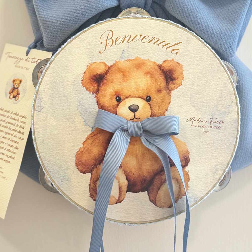 La Cinta de ternura Teddy Madame interpreta el nacimiento con un estilo delicado: una gran roseta azul cielo y una pandereta decorativa central con la ilustración de un osito de peluche y las palabras Bienvenido. Las cintas tono sobre tono completan el conjunto con una nota romántica, adecuada para ambientes Shabby Chic.