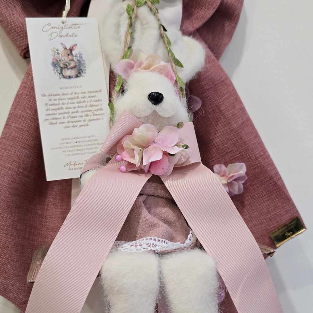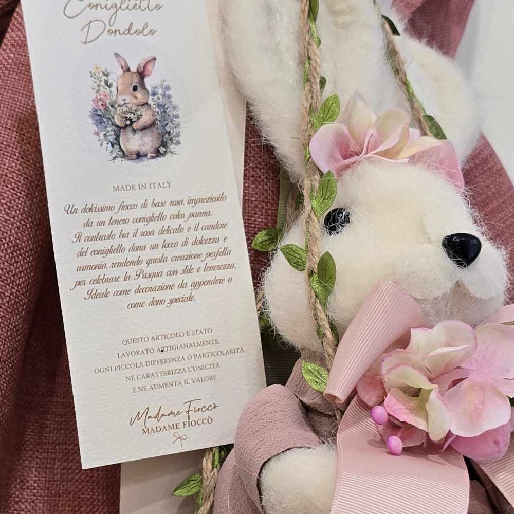 Este lazo de Pascua en rosa antiguo aporta un ambiente suave y romántico al hogar: los amplios pliegues, las suaves cintas y los detalles florales acompañan a un conejito decorativo en el centro de la композиion, con un elemento oscilante que le confiere movimiento y encanto.
