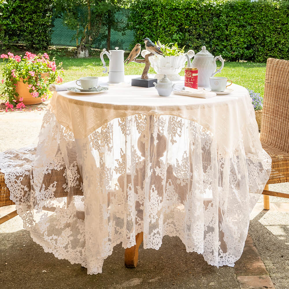 Mantel cuadrado de encaje Flora con volante, hecho a mano en Italia por Chez Moi . Color galleta (marfil). También puedes utilizarlo como mantel.