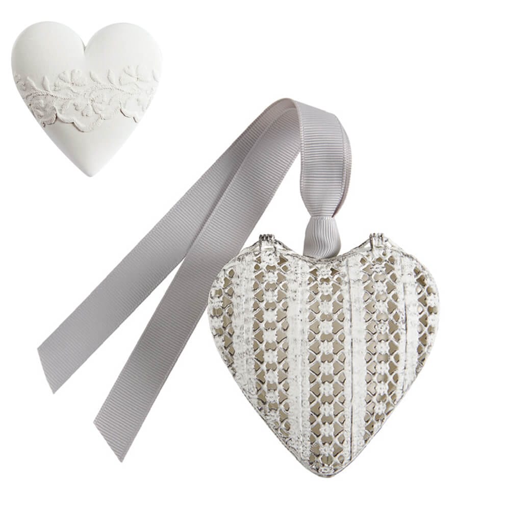 Descubra el Corazón de Metal Perforado con Decoración Perfumada Marquise de Mathilde M., un accesorio elegante y versátil que combina estilo y funcionalidad. Realizado en metal perforado de color blanco antiguo, el corazón contiene una decoración perfumada con la fragancia «Fleur de Coton», caracterizada por notas sensuales de maderas preciosas y almizcle, para un aroma sofisticado y envolvente. Perfecto para decorar una habitación, un armario o una cómoda, este corazón se acompaña de una bolsa de organza blanca, lo que lo convierte en una refinada idea de regalo para cualquier ocasión. El diseño romántico con detalles florales y cinta decorativa aporta un toque shabby chic, ideal para hogares elegantes y acogedores.
