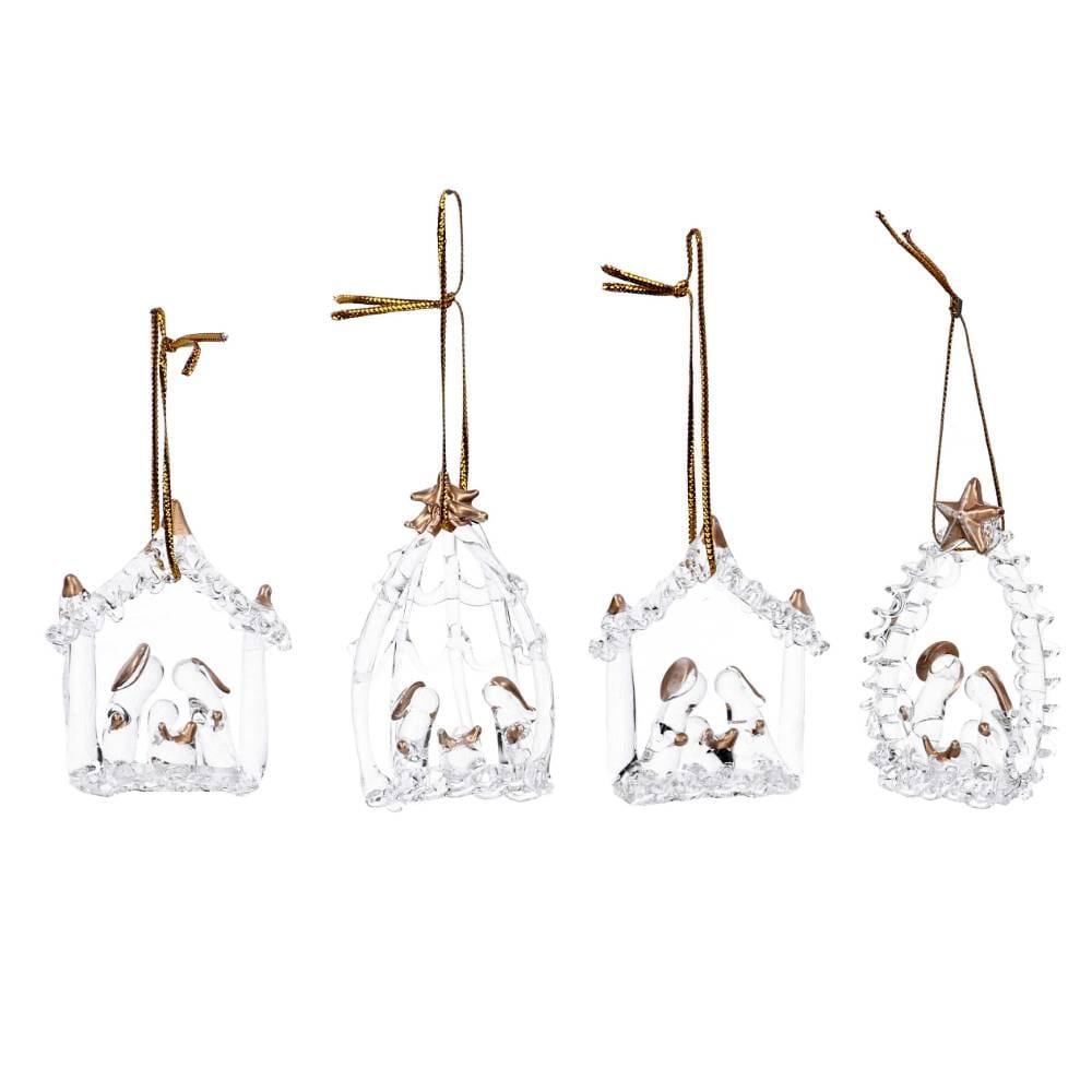 Decoración navideña de cristal con el Nacimiento y detalles dorados. Cuatro versiones surtidas, vendidas individualmente.