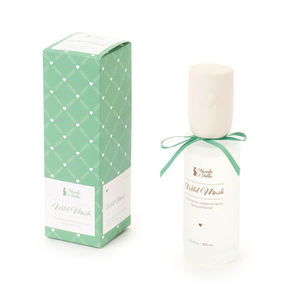 Dale a tus habitaciones un ambiente acogedor y sofisticado con el difusor de fragancias Wild Musk de Nuvole di Stoffa . Este elegante difusor destaca por su diseño refinado: una botella de vidrio esmerilado con un tapón de cerámica blanca, adornado con un delicado lazo verde. La caja a juego con un motivo geométrico verde completa el paquete, convirtiéndolo también en una gran idea para regalar.