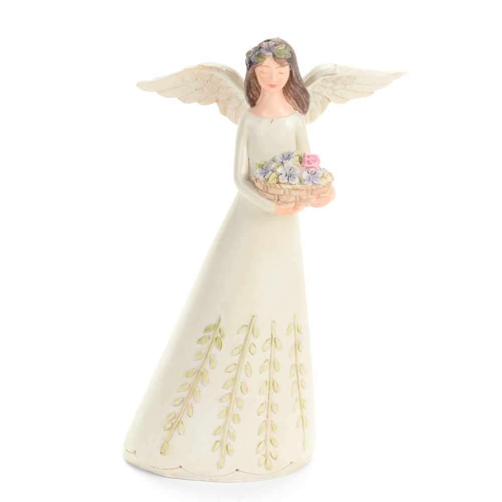 Ángel decorativo de resina de la Colección Fiorirà, acabado marfil mate. Alas abiertas con relieve, pelo castaño y corona floral en tonos lila/verde. En las manos sostiene una cesta tejida llena de flores en tonos pastel (azul claro, lila y una rosa rosa). Vestido largo con brotes verdes en relieve y borde ondulado.