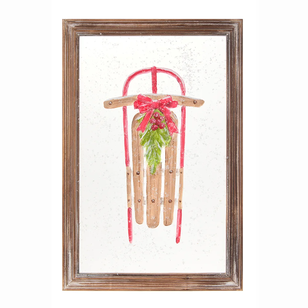 Cuadro navideño) en un marco de madera con estampados vintage y colores pastel. El diseño presenta un tobogán vintage con muérdago y lazo rojo y lienzo transparente.