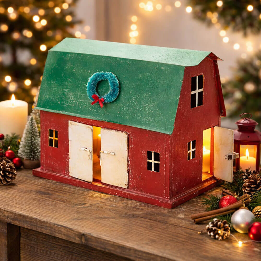 Granero de metal rojo con techo verde decorado con una corona. Ideal para decorar tus habitaciones durante las fiestas navideñas.