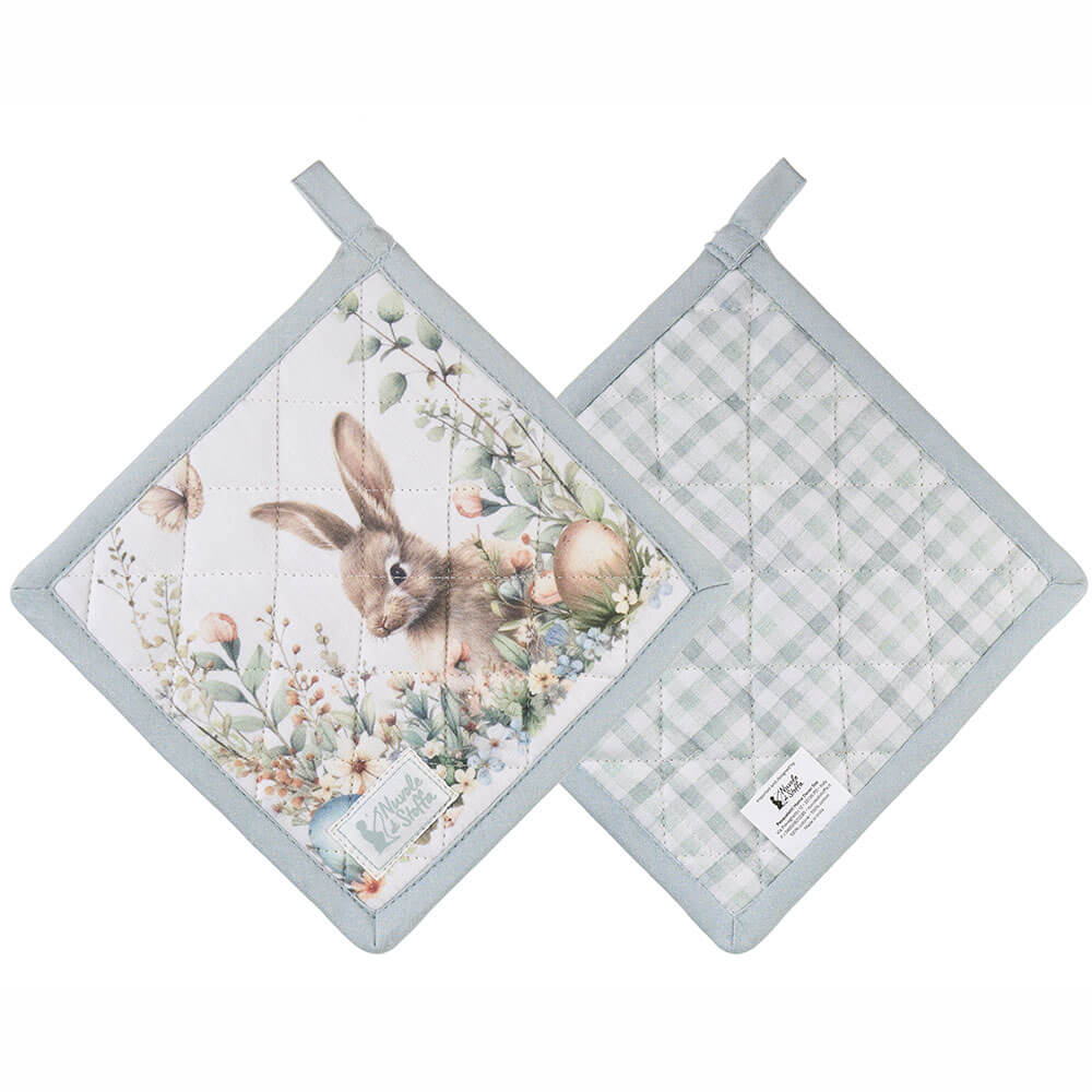 Este portamacetas de doble cara de algodón acolchado Nuvole di Stoffa, colección PePen, es un accesorio indispensable que combina estética y practicidad. La cara decorativa presenta un conejito de peluche rodeado de flores primaverales, huevos de Pascua y una mariposa, con delicados colores pastel y un acabado mate. El reverso a cuadros verde salvia es discreto y elegante, ideal para el uso diario. El acolchado interior protege del calor, mientras que el borde acabado y el gancho cosido permiten colgarlo fácilmente. Perfecto para coordinar con paños de cocina, caminos de mesa y manteles individuales de la misma colección, para una cocina armoniosa y cuidada.