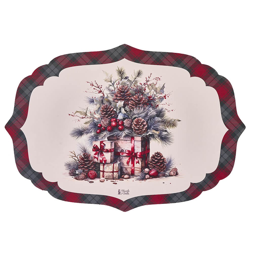 Lleva a la mesa el ambiente cálido y refinado de la Navidad con el mantel individual de vinilo Nuvole di Stoffa. El motivo representa una armoniosa composición de regalos envueltos con lazos rojos, piñas, bayas y ramas de acebo, sobre un fondo marfil. El borde perfilado con un motivo de Tartan rojo y verde enmarca la escena con un estilo campestre elegante y atemporal.