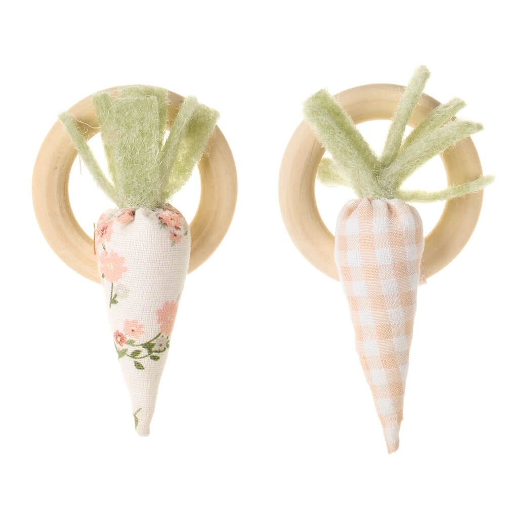 Servilletero de madera de Pascua con una deliciosa zanahoria de tela. Dos modelos disponibles: floral y cuadros beige. Perfecto para decorar tu mesa con un estilo único y festivo.
