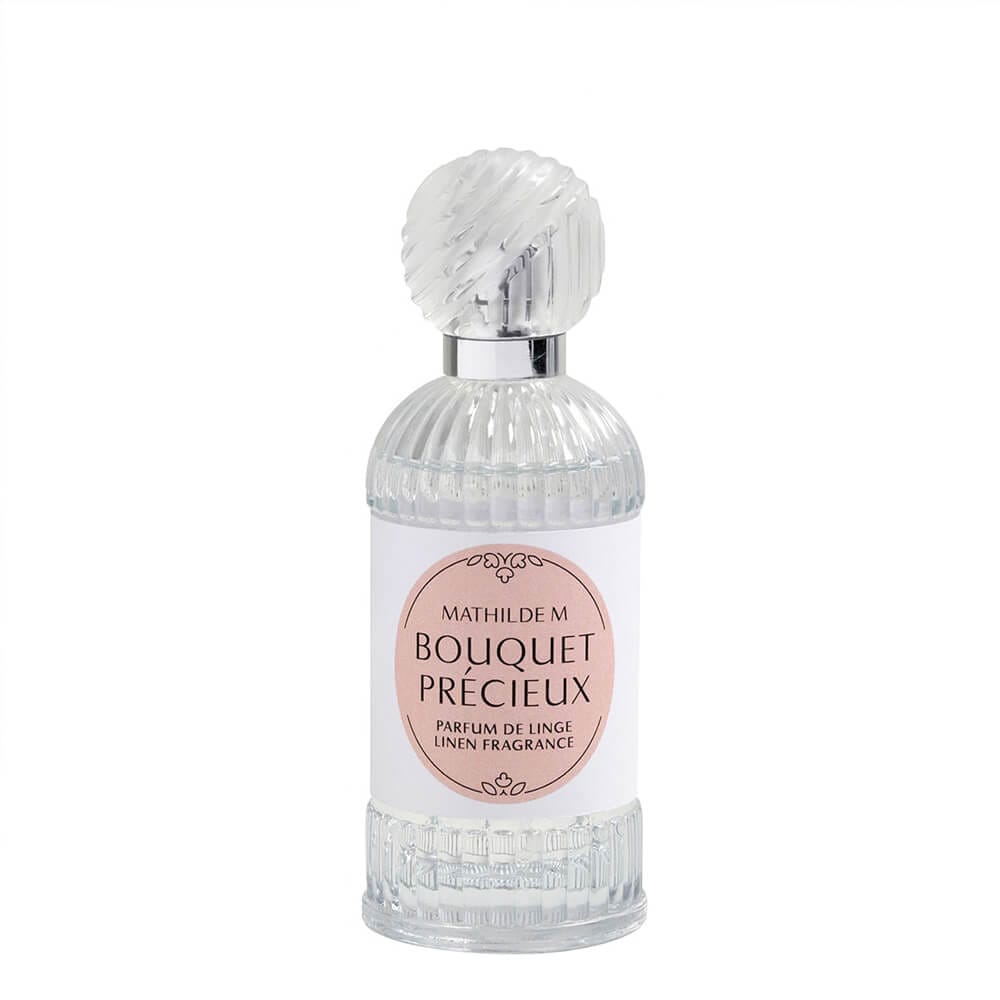 El perfume de tela Bouquet Précieux de Mathilde M es una elegante creación de la colección Les Intemporelles, diseñada para añadir un toque de sofisticada feminidad a sábanas, cojines, plaids y cortinas. Encerrado en un frasco de cristal transparente finamente trabajado con relieves verticales y cerrado por un tapón transparente moleteado de aire retro, este perfume es también un refinado objeto decorativo.