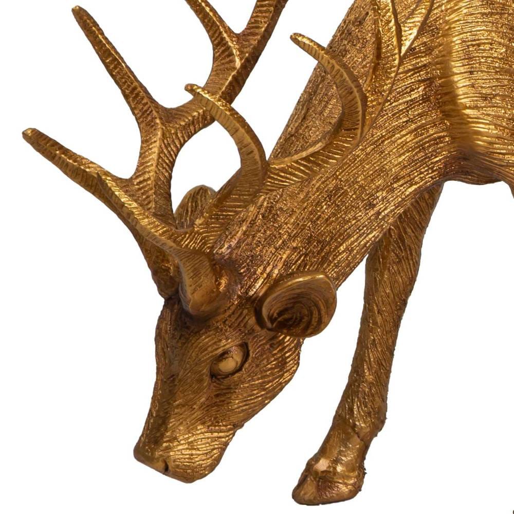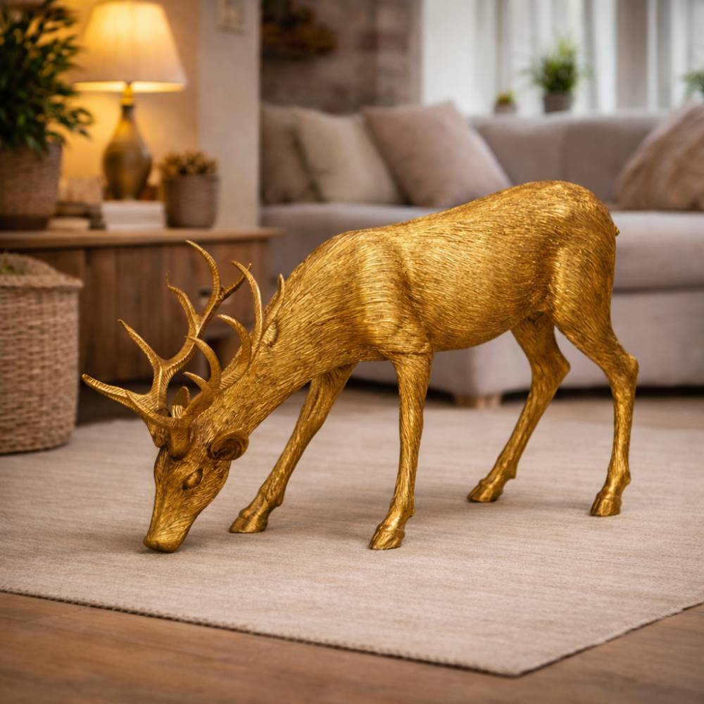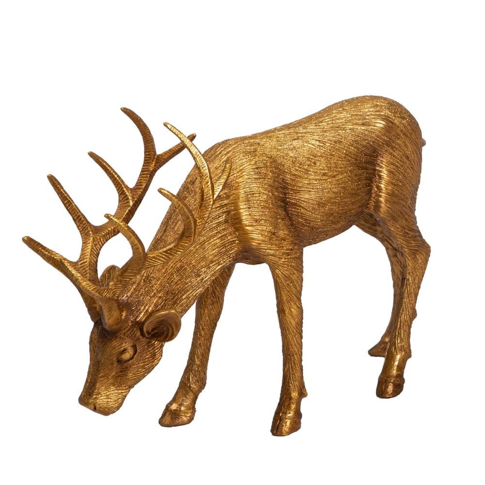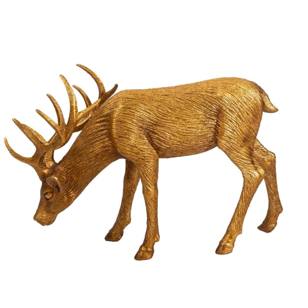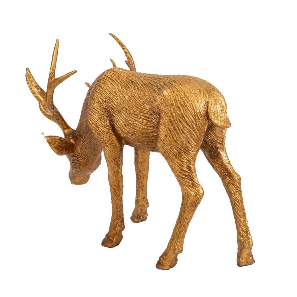 Aporta un toque de elegancia y magia a tu decoración navideña con este magnífico reno de resina dorada. El efecto esculpido del pelaje, la postura orgullosa y la majestuosa cornamenta hacen de esta figura un elemento de decoración escénica para los que adoran impresionar durante las fiestas.