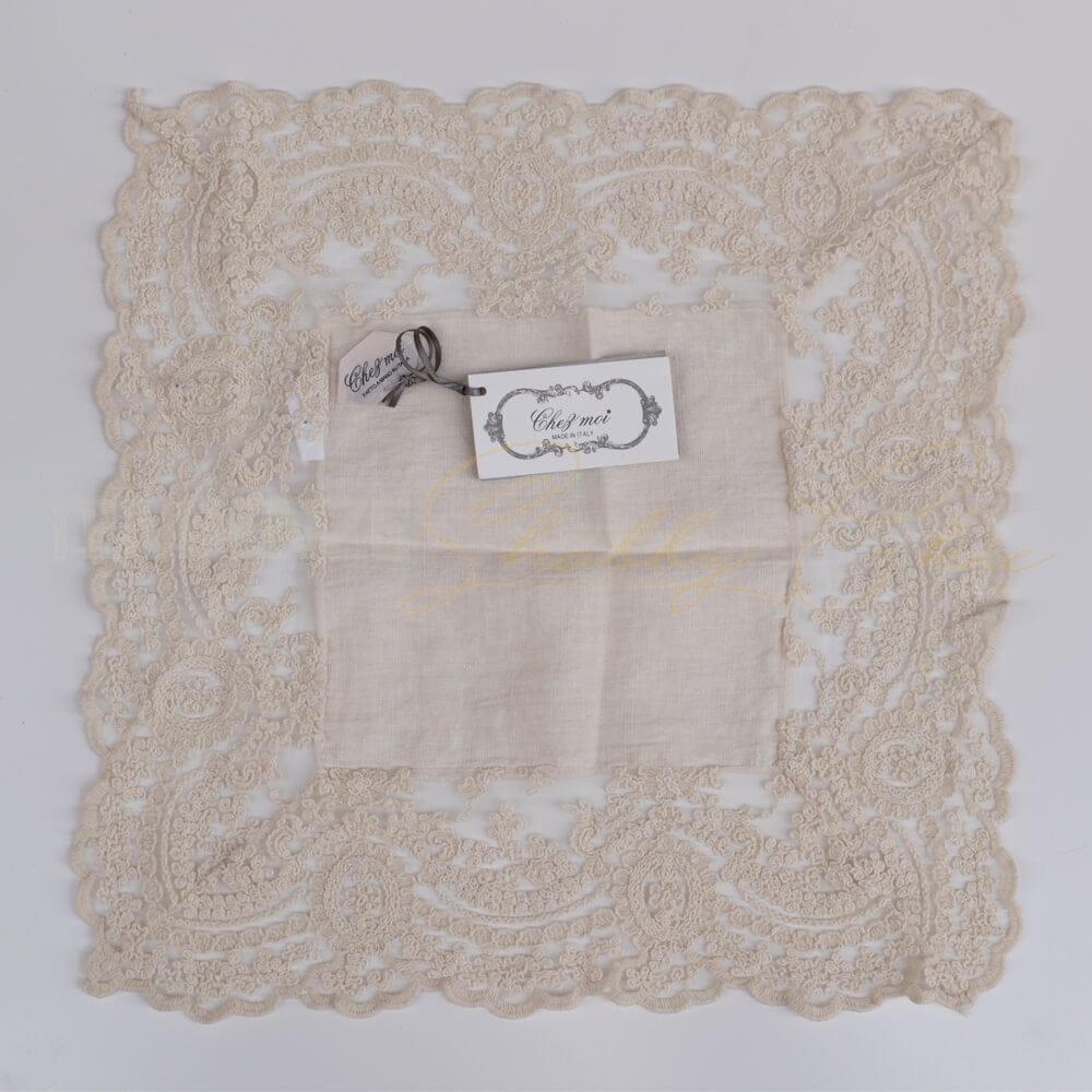 Mantelina de lino con marco en pizzo corinzio, color biscuit. Hecho a mano en Italia por Chez Moi.