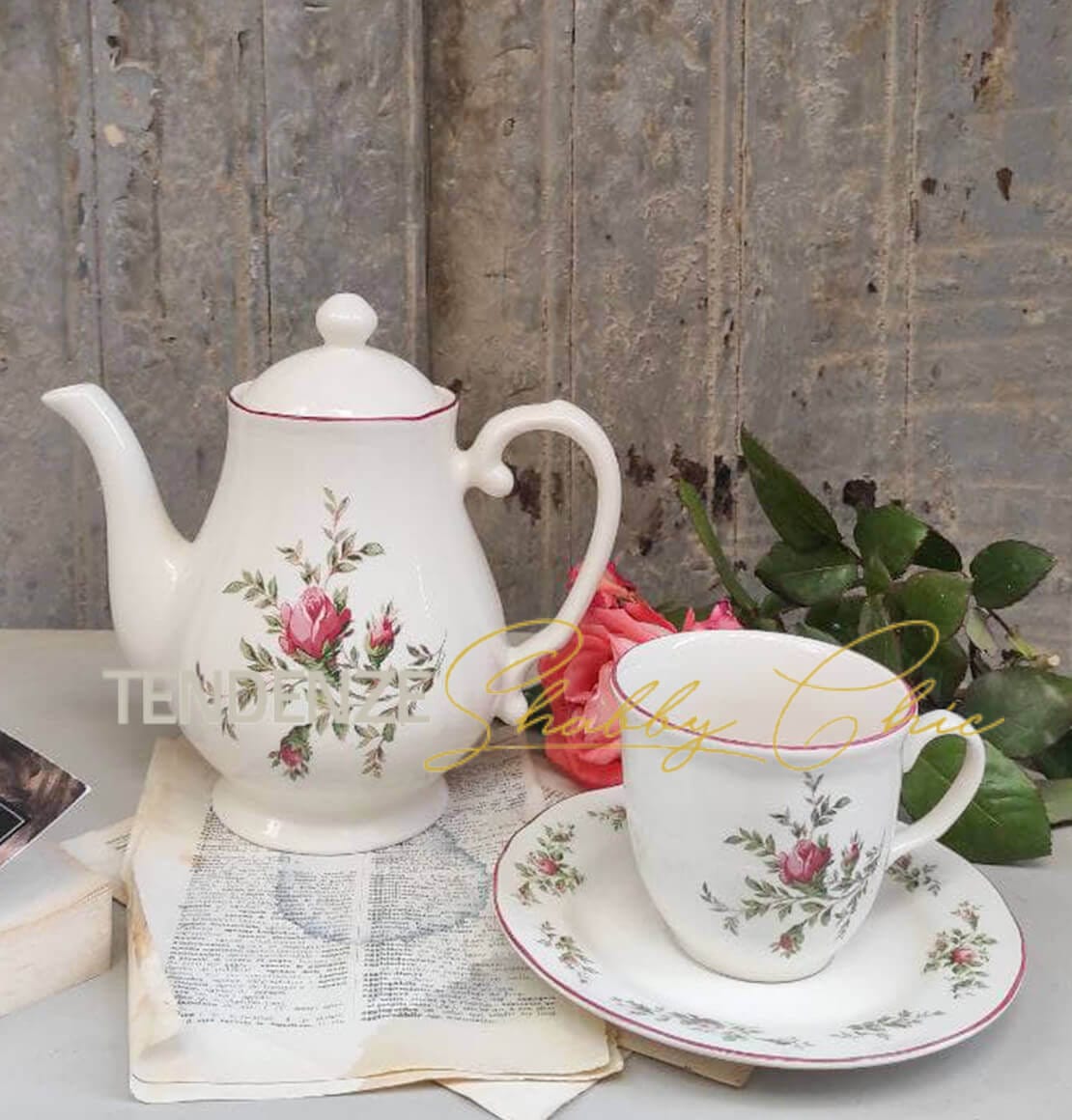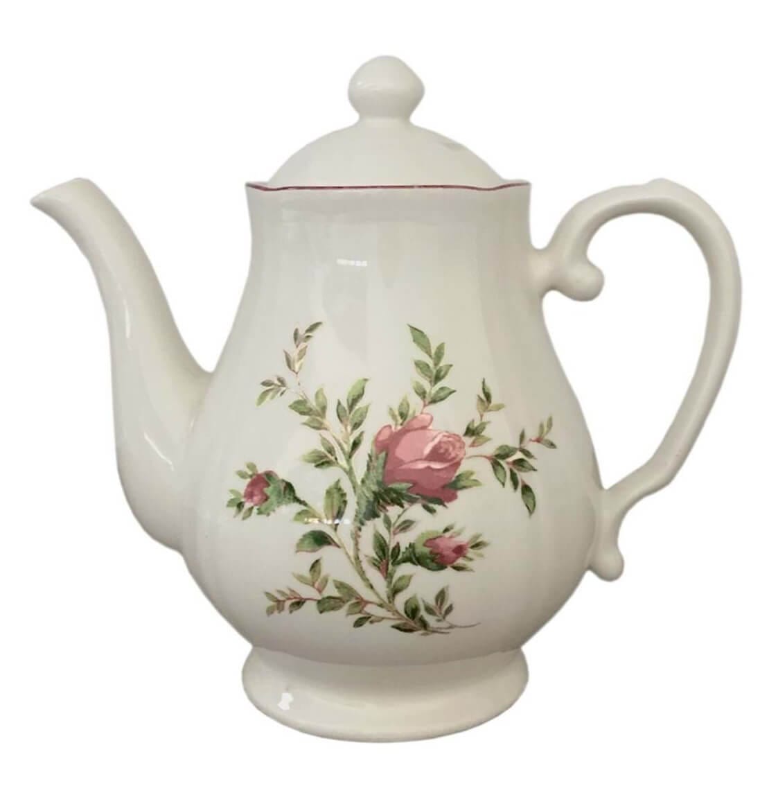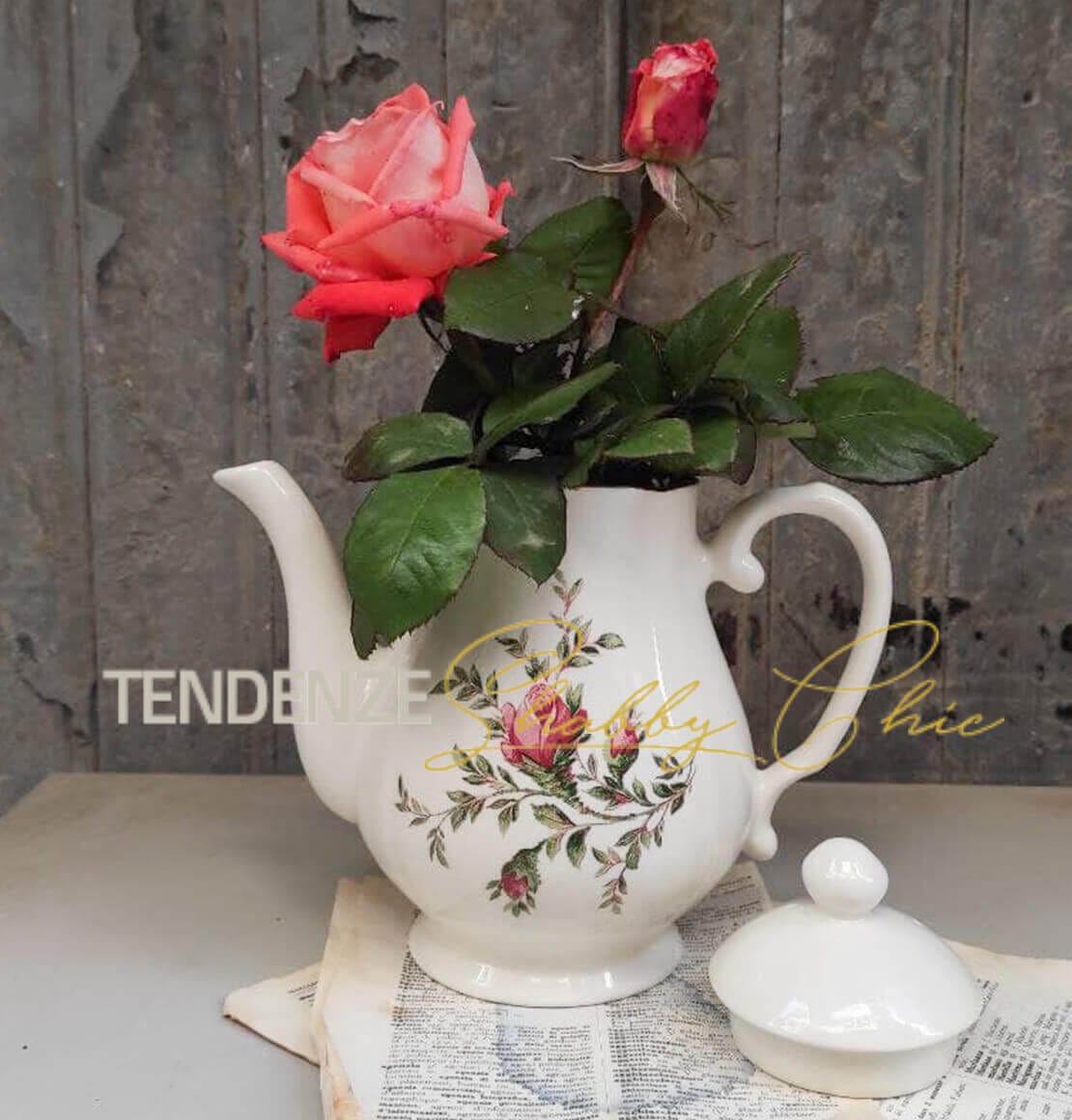 Tetera de cerámica blanca con motivos florales, de la colección Rosas de musgo de Blanc MariClò.