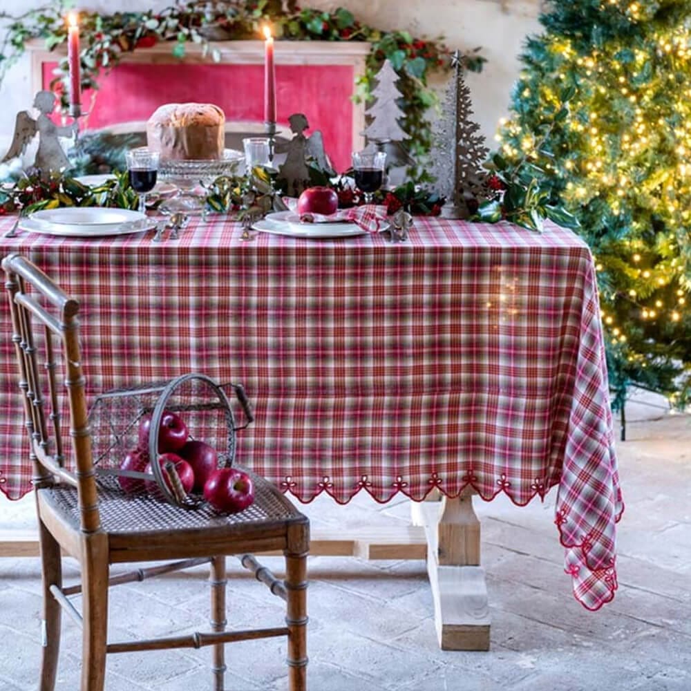 Nappe en coton à motif Tartan et bord festonné brodé, parfaite pour une table de Noël chaleureuse et accueillante.
