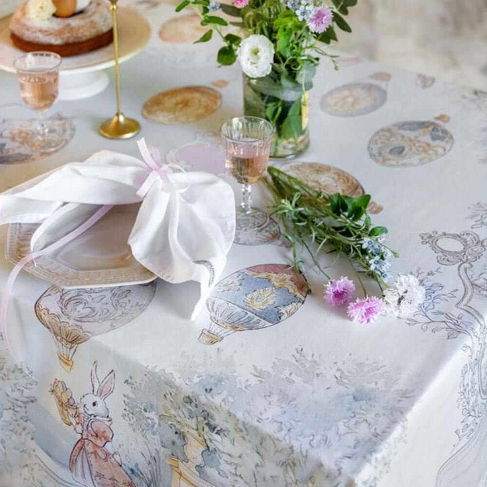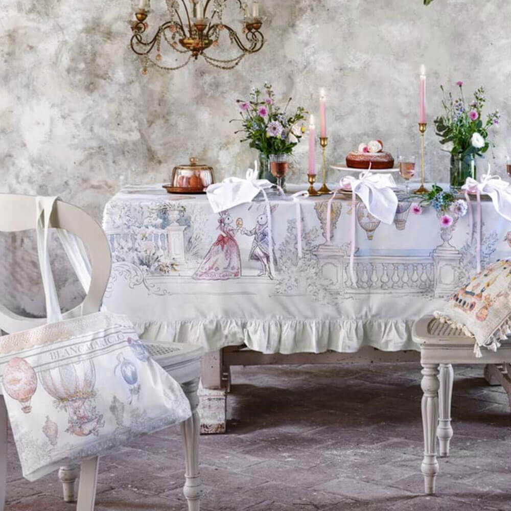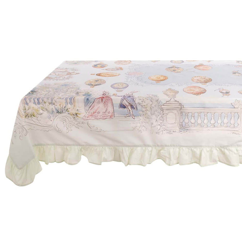 Rendez votre table unique avec la nappe Blanc MariClo de la collection Rococo, ici proposée dans la version gala de 10 cm. Réalisée en 100 % coton, cette nappe attire le regard avec un imprimé inspiré de l’esthétique du XVIIIe siècle: montgolfières peintes, paysages romantiques et adorables personnages de contes de fées.