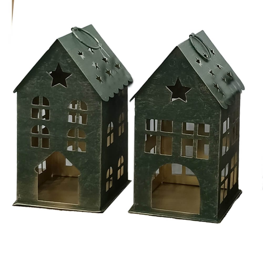Paire de maisons vintage en métal vert avec des étoiles et des fenêtres perforées. Porte-bougies à suspendre ou à poser.