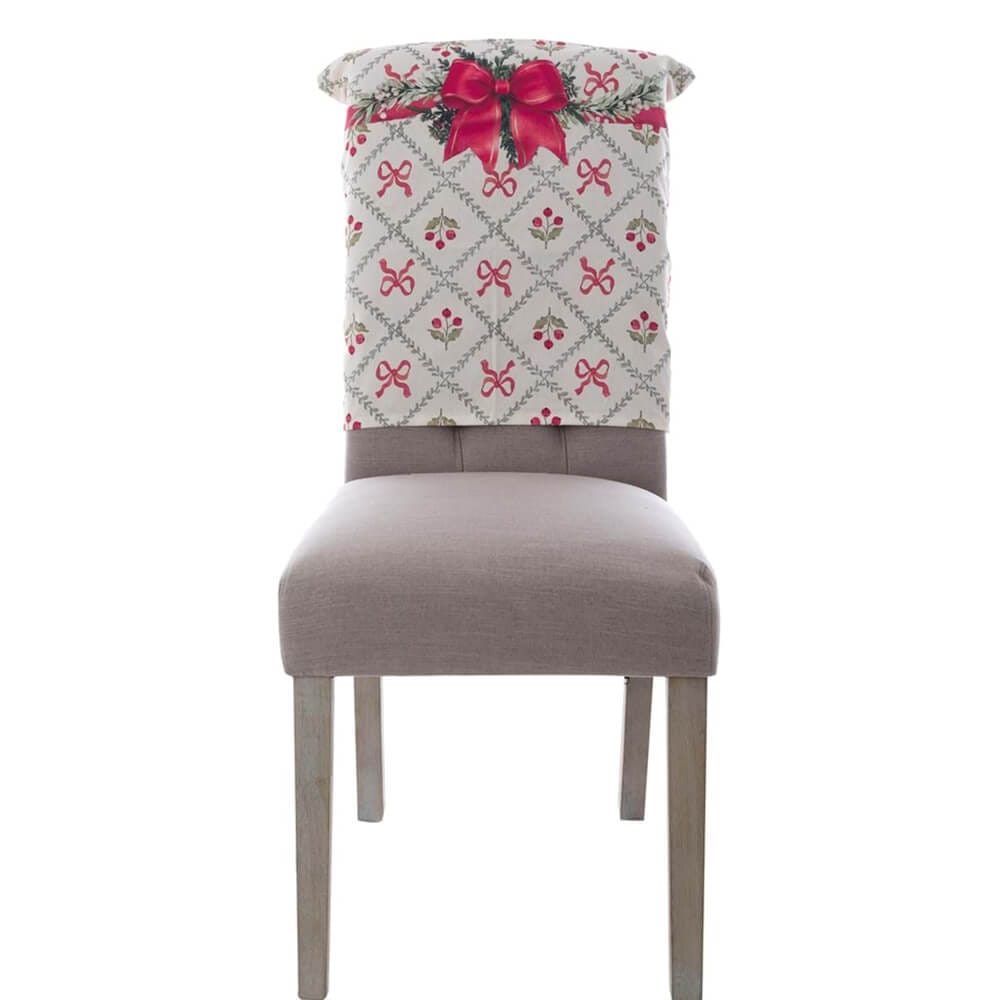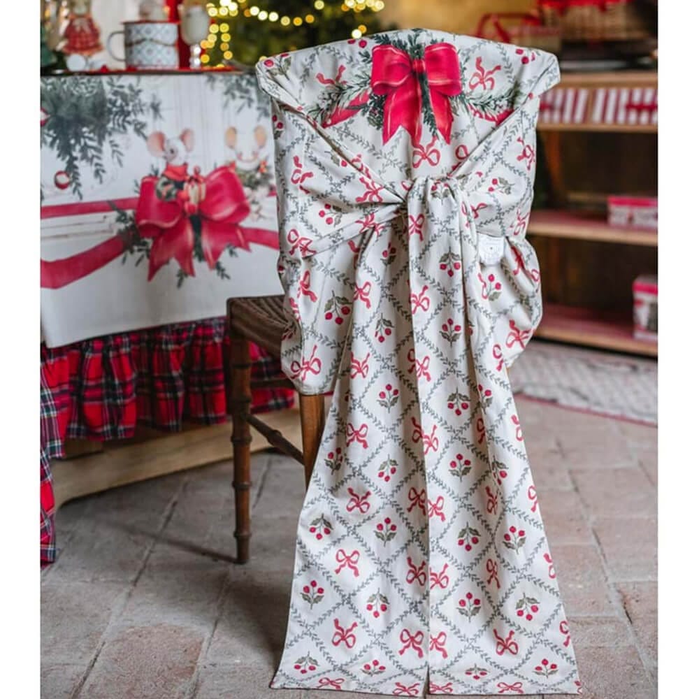 Couvrez vos chaises avec la housse de dossier en pur coton, décorée de nœuds rouges et de gui, agrémentée d’un grand nœud central. Collection Christmas Fairytale.