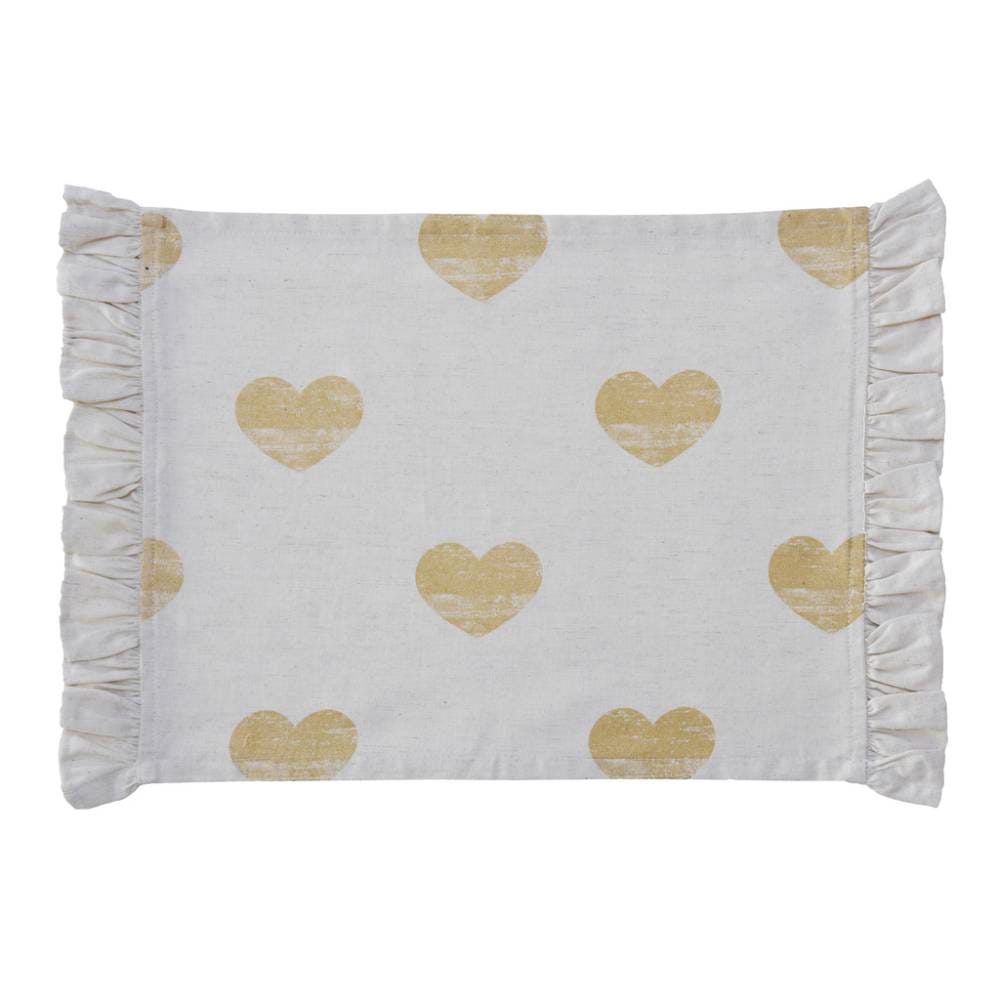 Set de table en coton écru avec des coeurs dorés et une galette enroulée sur le côté. Romantique et raffiné.