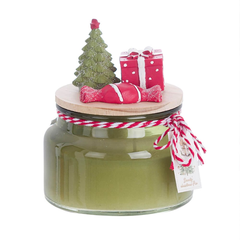 Enfermé dans un pot en verre vert, il est doté d’un couvercle en bois finement décoré d’éléments tridimensionnels : un petit sapin, un paquet cadeau et un bonbon rouge à paillettes. Une touche ludique et raffinée à exposer sur les étagères, les tables ou les rebords de fenêtre pendant les fêtes.