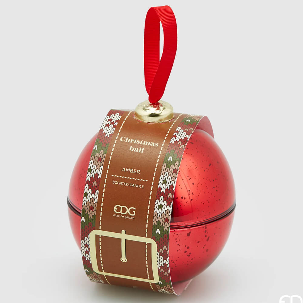Bougie sphérique en verre rouge parfumée à l’essence d’Ambre par EDG . Une jolie idée cadeau, sa forme de boule de Noël la rend idéale pour la période de Noël.
