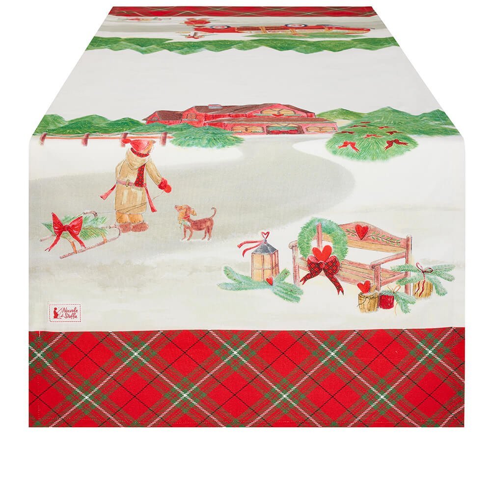 Décorez votre table de Noël avec ce splendide chemin de table 100% coton de la collection de Noël  » Cartolina di Natale  » de Nuvole di Stoffa . Avec des dimensions de 150×50 cm , ce chemin de table est parfait pour créer une ambiance festive et accueillante pendant les vacances. Le chemin de table présente une scène de Noël enchanteresse avec une maison décorée, des arbres enneigés et des détails festifs qui capturent la magie de Noël. La bordure est décorée d’un motif tartan classique rouge et vert.