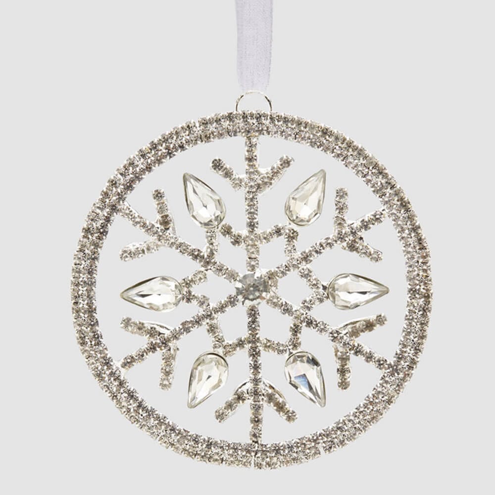 Décoration suspendue en forme de flocon de neige avec pierres précieuses et paillettes.