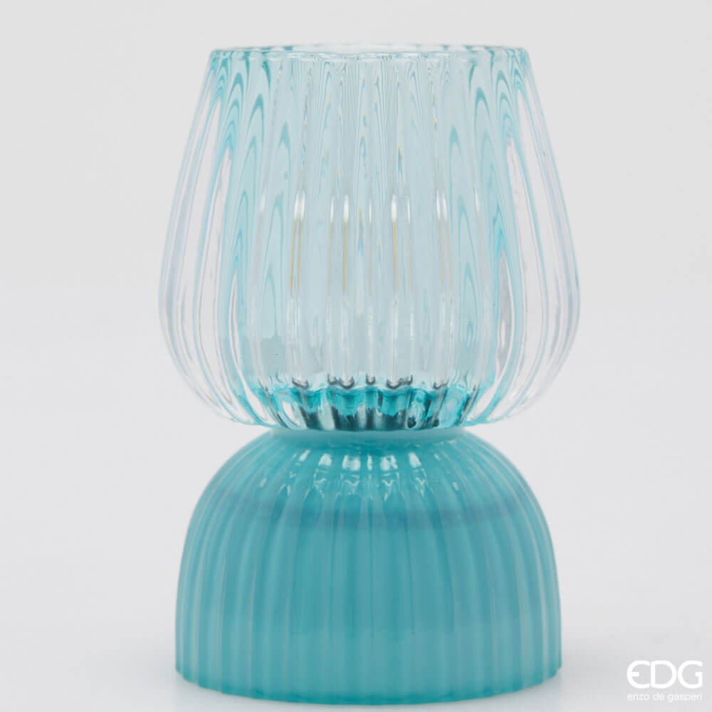 Lampe à poser EDG en verre rayé bleu clair avec socle assorti. Lumière LED chaude, design élégant et compact, idéal comme point lumineux décoratif.