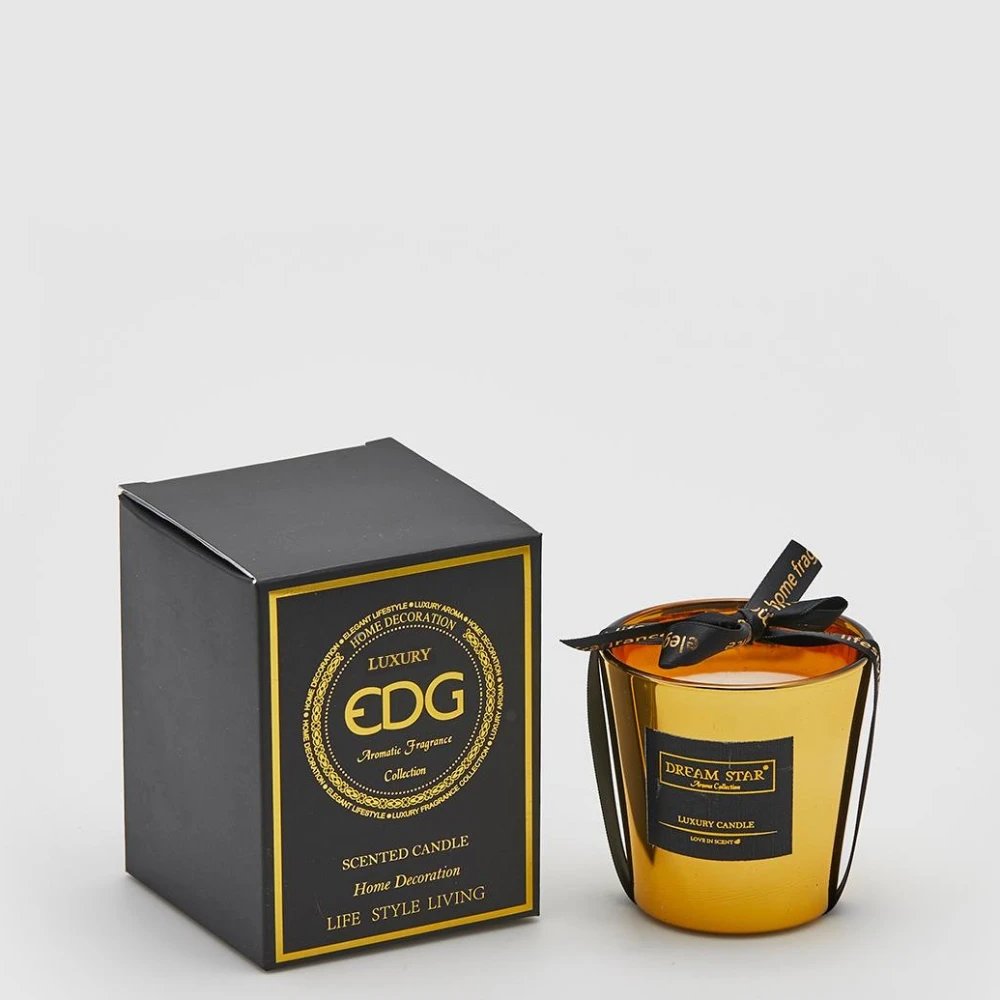 Bougie élégante parfumée à l’essence de champagne, dans un pot en verre doré miroir très raffiné.